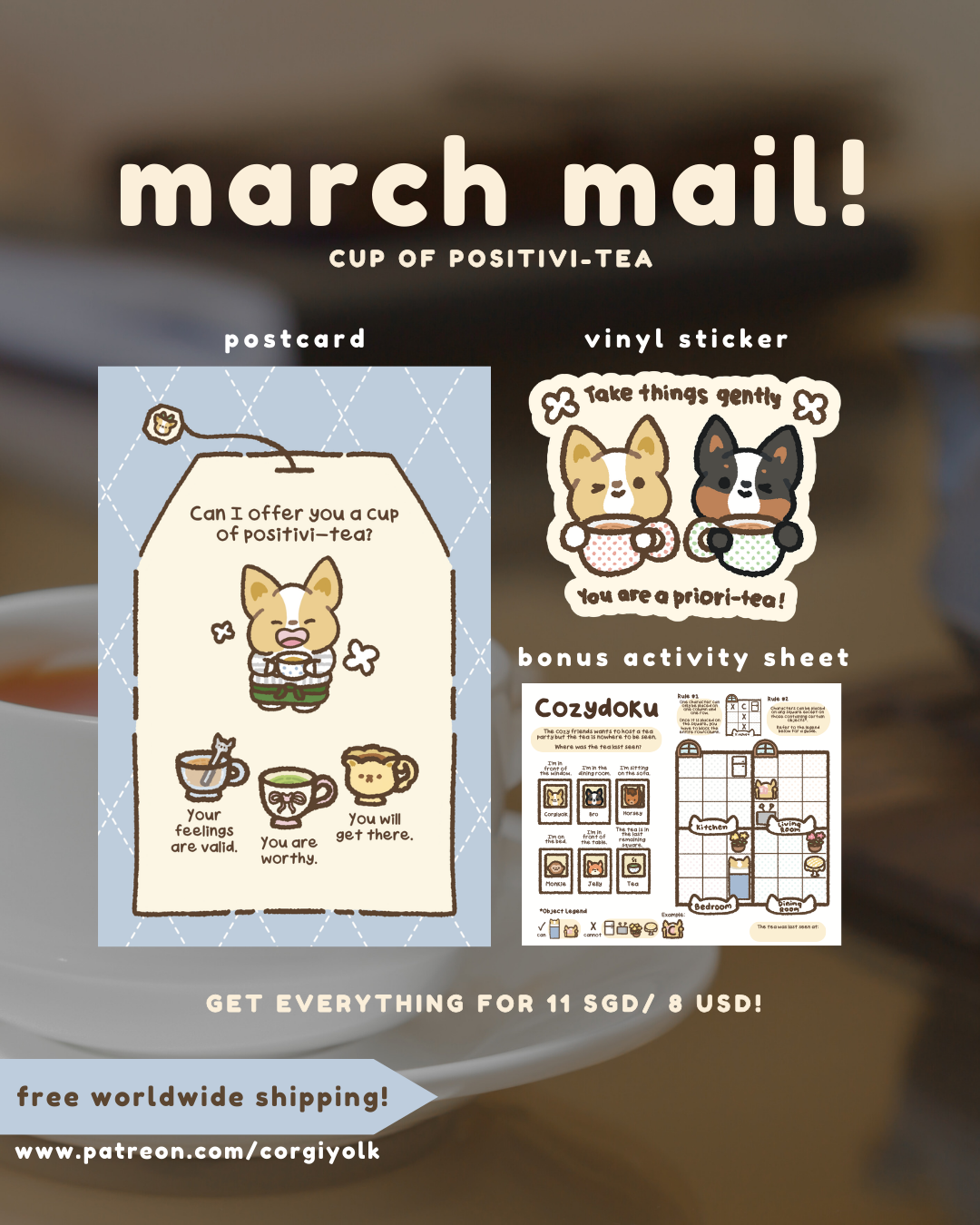 Monthly mail club filled with comfy goodies from the heart. Receive this mail set including a postcard, sticker, letter, and bonus goodies when you join.
